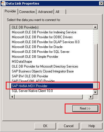 This provides a list of standard connectors which MS Excel has to different databases. Thankfully, SAP HANA is also one of them. Choose the SAP HANA MDX Provider as shown below. And press Next.