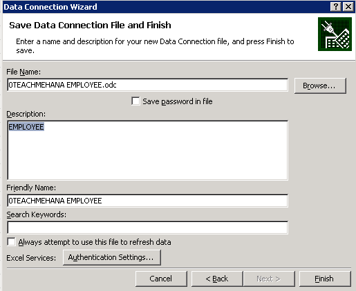 This is the final step of creating the connection file or the “.odc” file. It autogenerates a file name and description for this file which you can change if you so which to. Press Finish to create this connection.