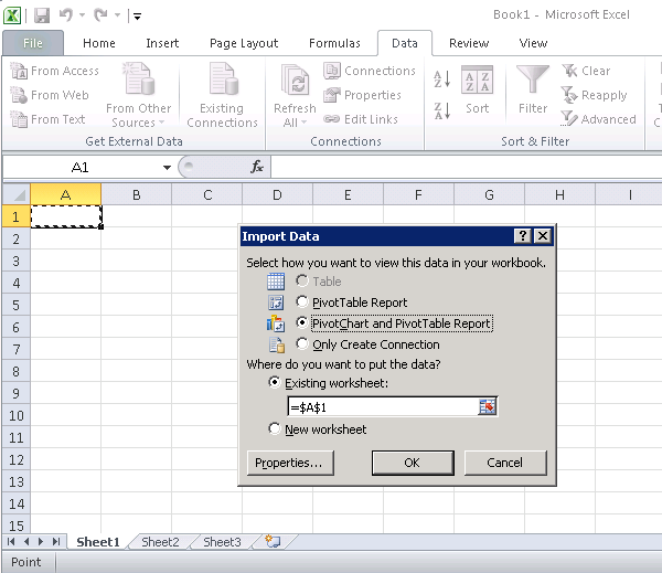 This brings up the data import wizard which asks if you want to create a report, a chart and a report or just a connection. You can also choose where these datasets would be placed in your excel.