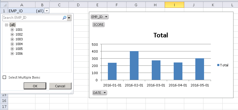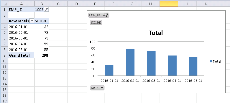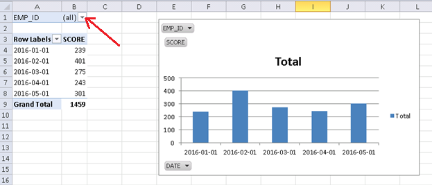 In our example, we drop SCORE to our “Values” pane, and we analyze the data by date and hence we drop this to the “Axis fields” pane and also we provide the filtering capability to this report by Employee ID which we thus drop to the “Report Filter” pane.