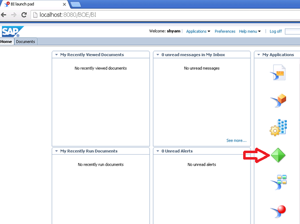 The usual Launchpad page opens up. Click on the crystal reports icon marked by the red arrow.