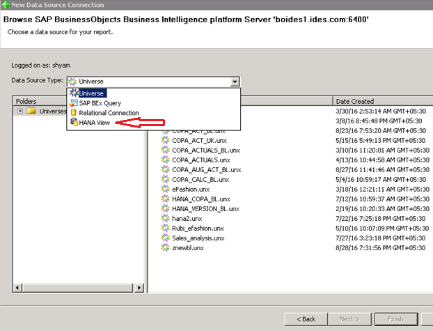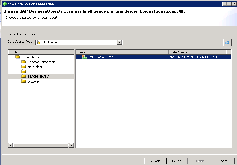 Once you click on that, it opens up a the list of folders on the Business Objects Repository. Here, we had an OLAP connection published inside the TEACHMEHANA folder. Let’s select that and press Next.