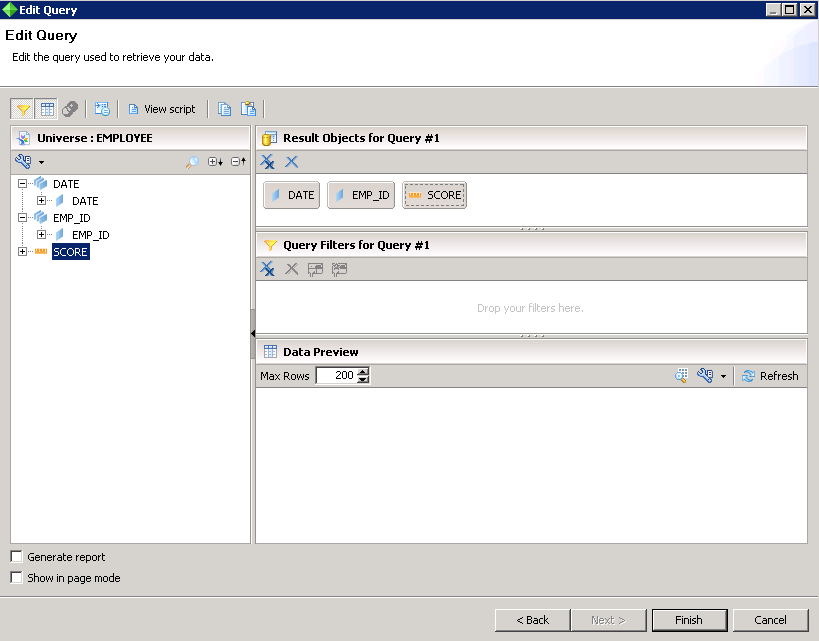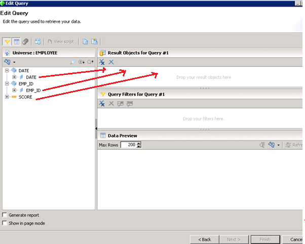 This opens up a query panel like the one we used to have in WebI. Drag the objects you want in the report to the “Result Objects” pane. Any type of filters can be also applied in the filters pane below, if required.