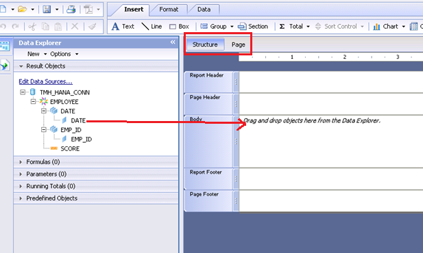 The design pane has 2 components – The Structure and the Page as marked below. The structure is where you define the skeleton of the report. Here, you provide the exact distance between columns, the fonts, colors , alignments and so on whereas the Page is where you would see how the data actually looks after all these alignments in the structure are completed.